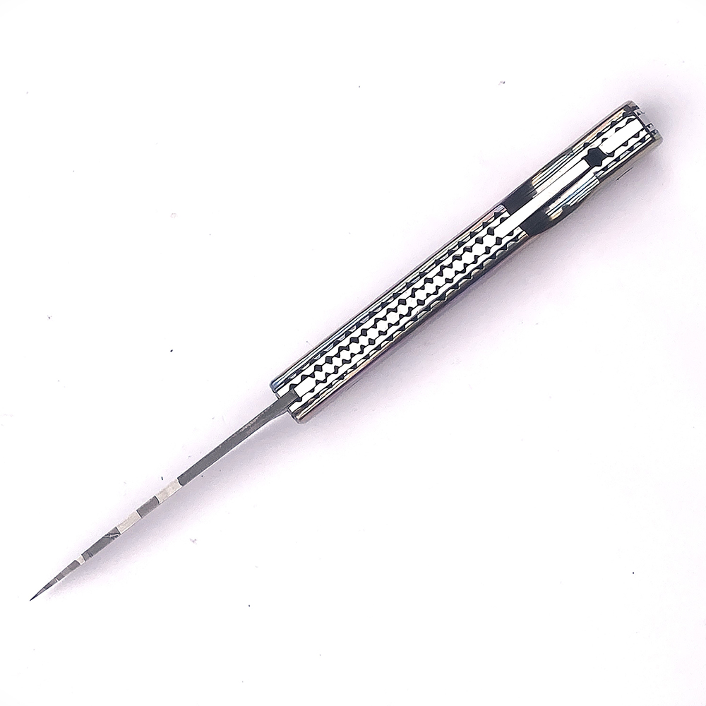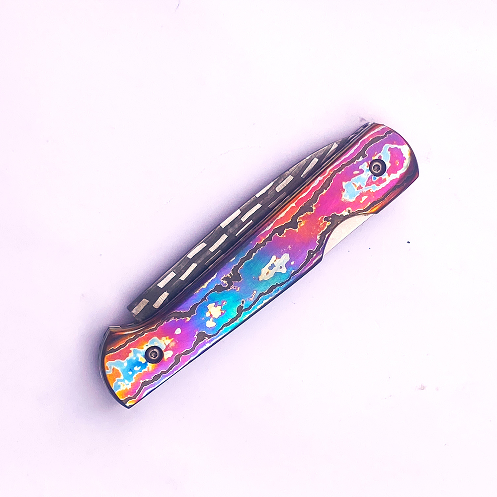 The scales on the handle of this folder will add to the beauty and functioning of this folder. This is the Timascus that is added on the folder. Timascus is a titanium alloy and layered steel that is very strong and known to turn pretty colours. Scales are not just eye-catching, with interesting design that will change every time the knife catches some light but can give a very comfortable and firm hold of the knife, which makes it feel very easy and safe.
