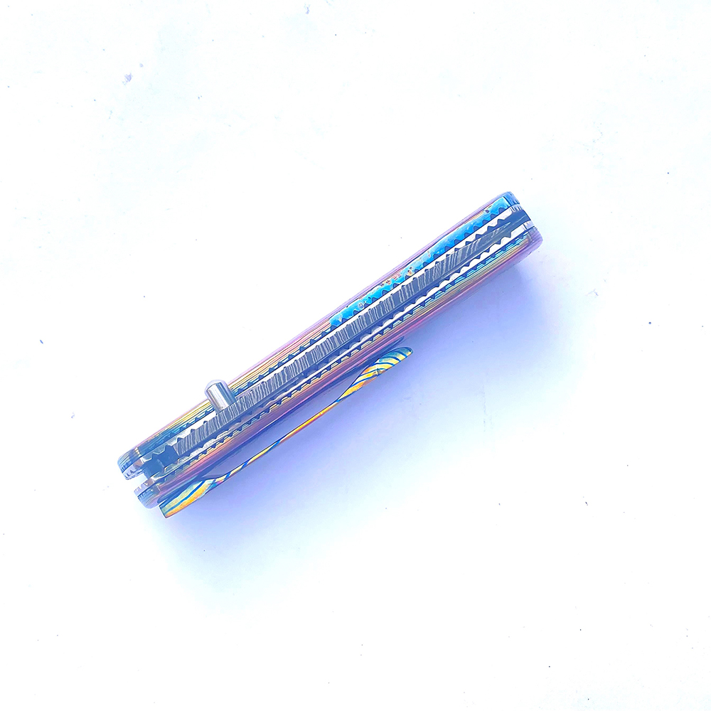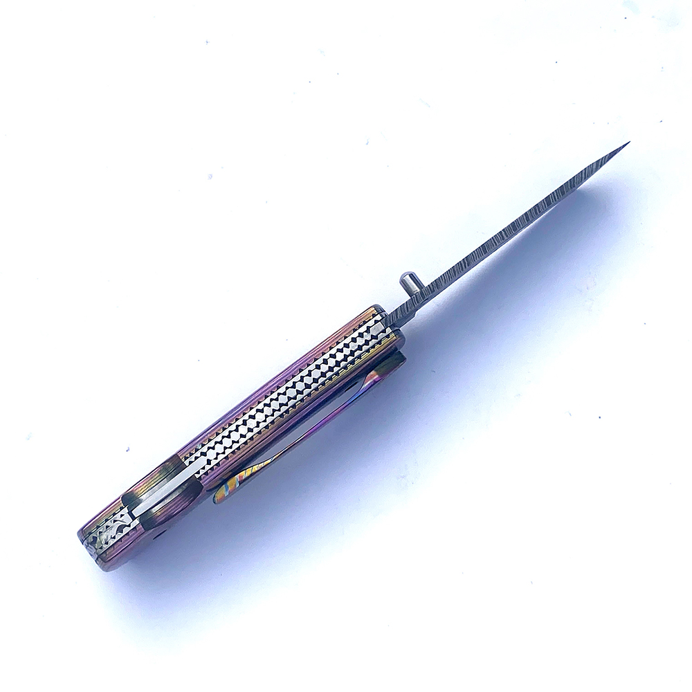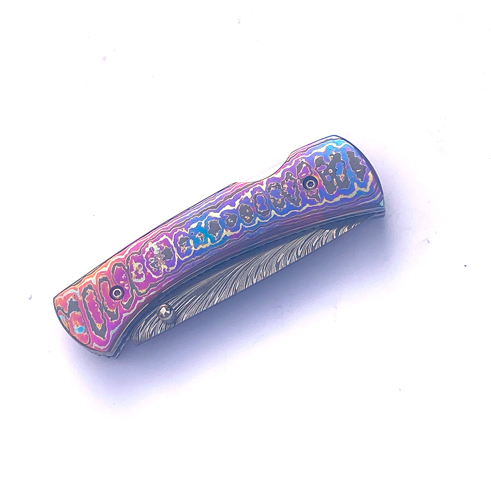 Its safety and performance are ascertained by the lockback arrangement that offers a safe and secure lock when the blade is open. Such a characteristic in conjunction with the beautiful mosaic pattern makes it very useful and beautiful at the same time. This is a knife whose handle is made of black Timascus scales manufactured of a high quality material prized with strength and impressive looks. Timascus, a mixture of titanium and stainless steel is also forged in order to provide itself with beautiful designs, which go with the intricate patterns of the blade.