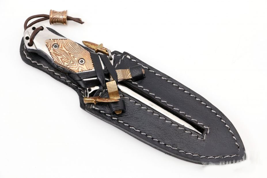 The Integral Dagger with Mokume Gane Inlays also includes a hand sewn leather sheath with belt loop where convenient transportation and safe maintaining are provided. As decorative, as training, or survival dagger, or as a component of your survival kit, this dagger will not disappoint.