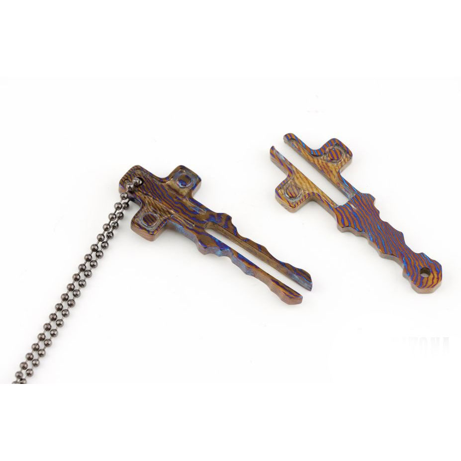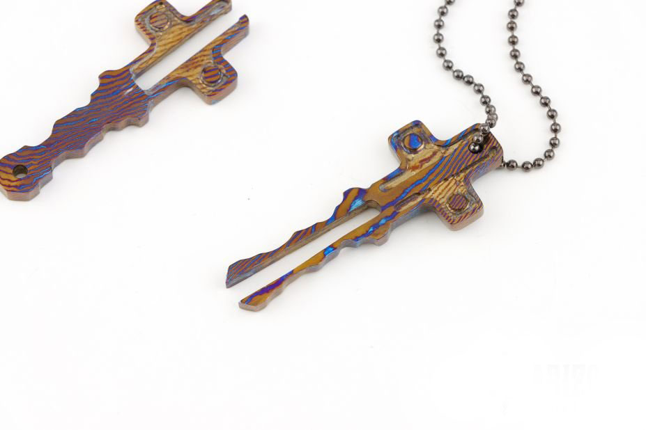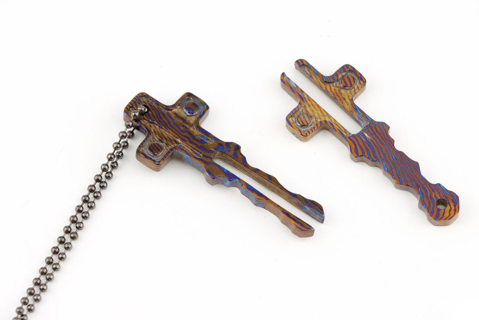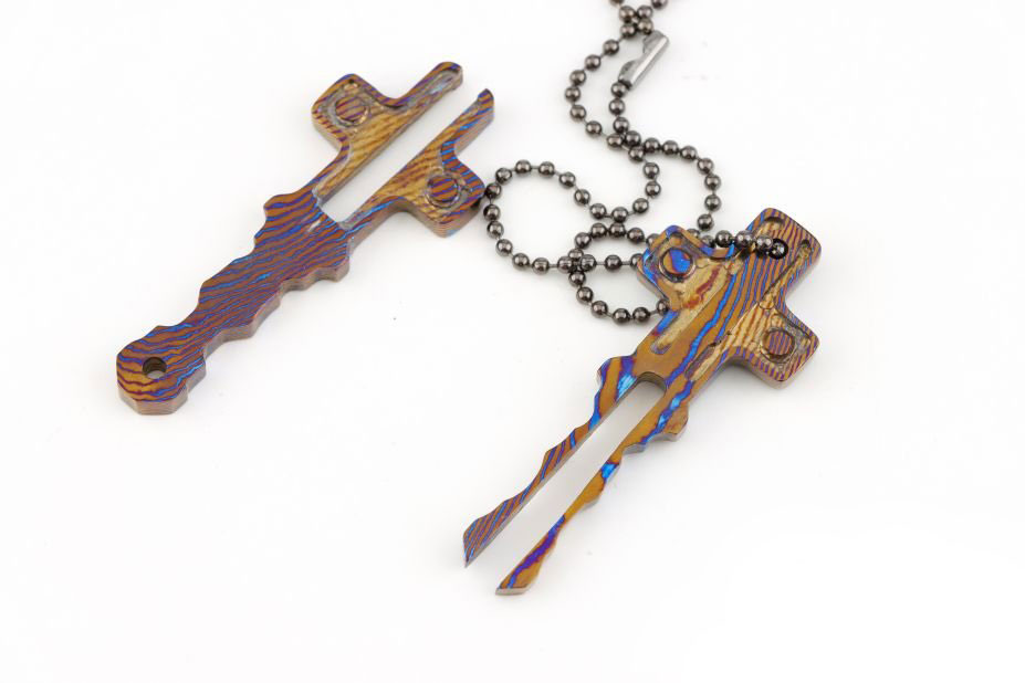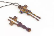 A striking Timascus cross Pendant shaped like an ancient key, blending spiritual symbolism with artisan metalwork. This titanium-zirconium alloy piece features vibrant heat-treated colors, perfect as a meaningful gift or statement Jewelryelry.