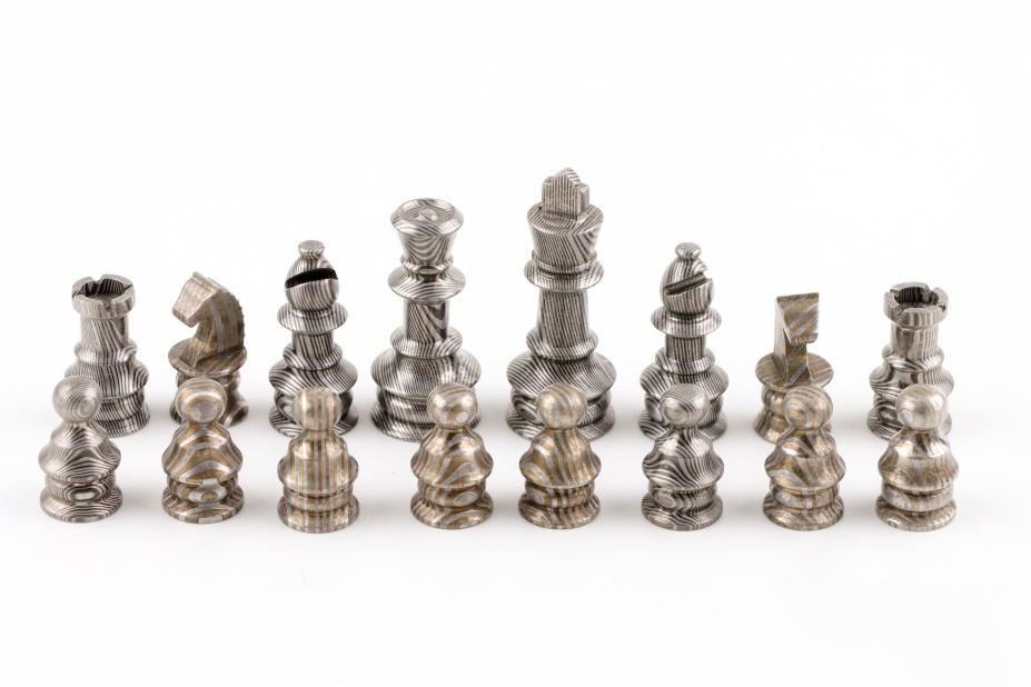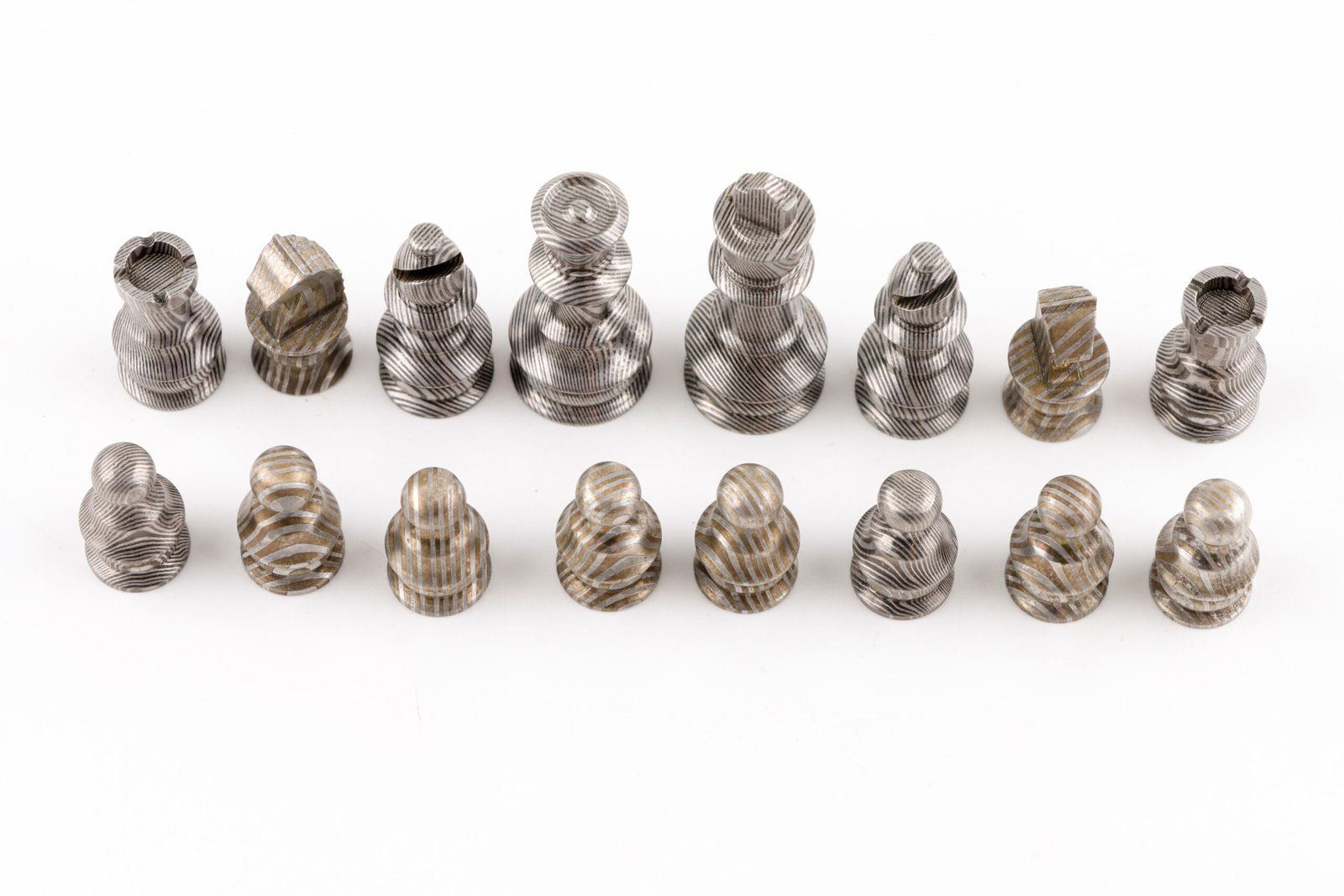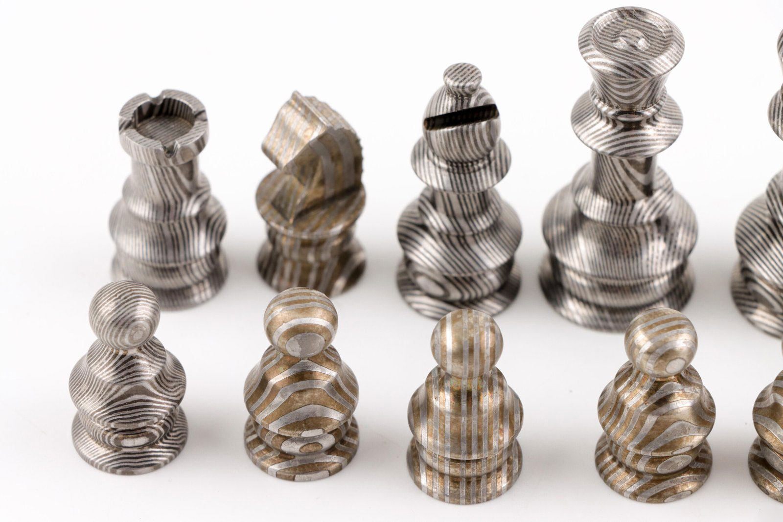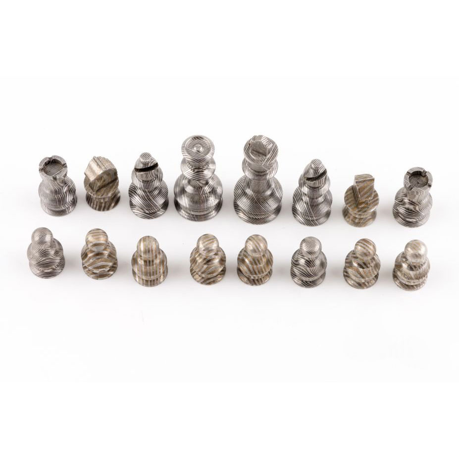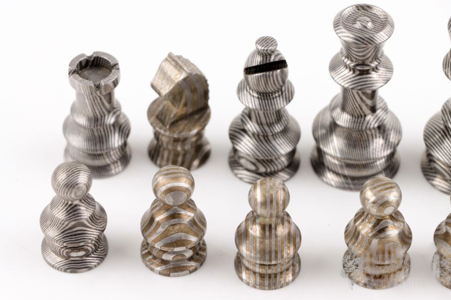 This exceptional chess set redefines luxury gaming with forged stainless Damascus Steel pieces that display mesmerizing water-like patterns. The 3.75″ king and queen are meticulously hand-turned from 304/316L stainless Damascus, revealing contrasting layers when acid-etched. Each piece is weighted for perfect balance and features felt bases to protect playing surfaces. The set includes: