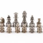 Housed in a hand-rubbed walnut case with velvet lining, this heirloom-quality set appeals to chess masters, metal collectors, and design enthusiasts alike.