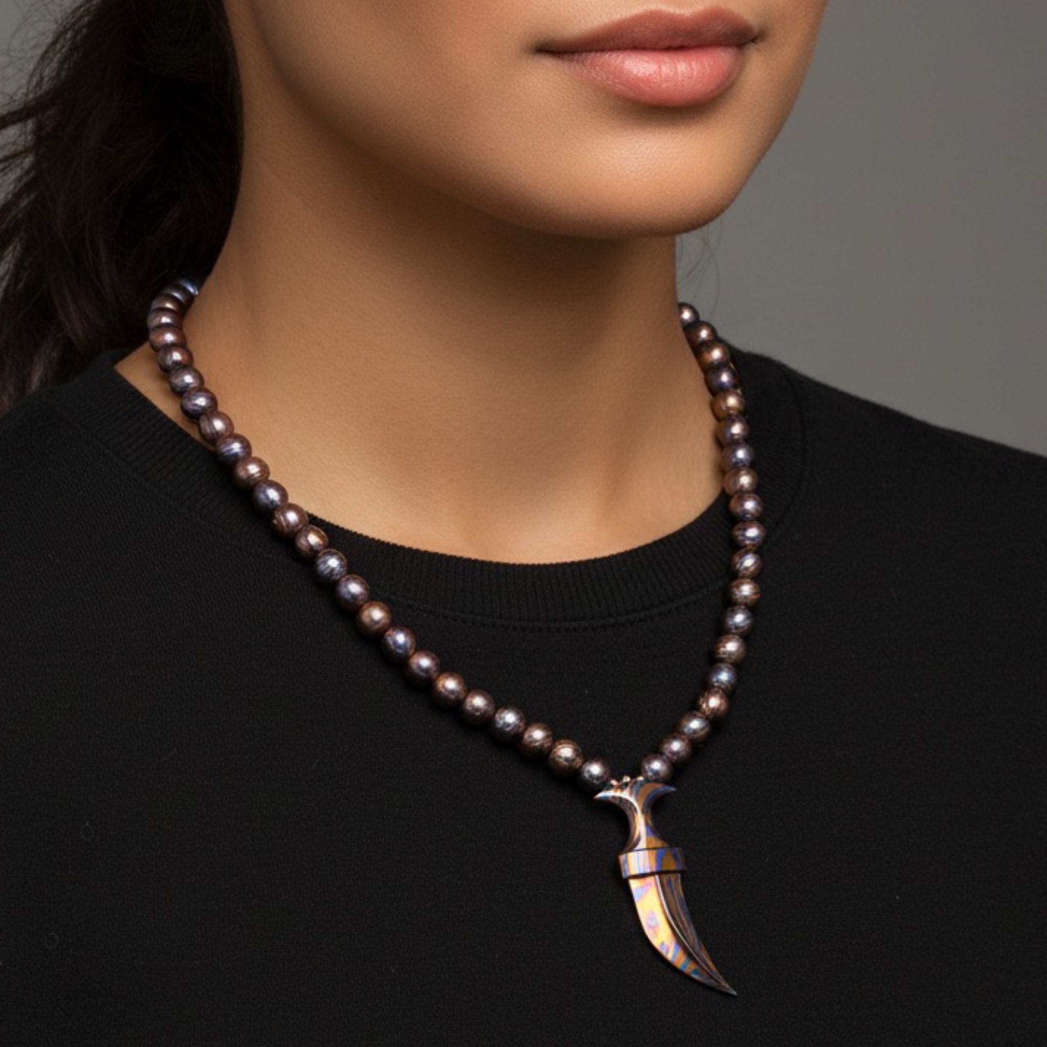 Make a bold statement with this Pearl Beaded Necklace featuring a Dagger Pendant, designed to combine elegance with strength. Hand-strung with 40 luminous pearl beads, each measuring 8.5mm, the necklace carries a refined yet powerful presence. The natural luster of the pearls adds a touch of sophistication, while the dagger pendant introduces a daring edge that symbolizes courage and individuality.