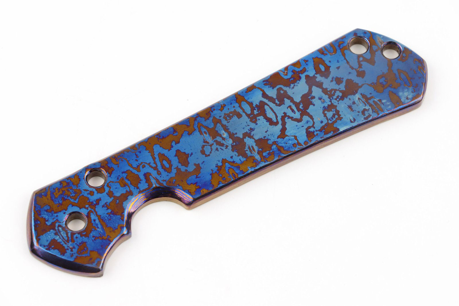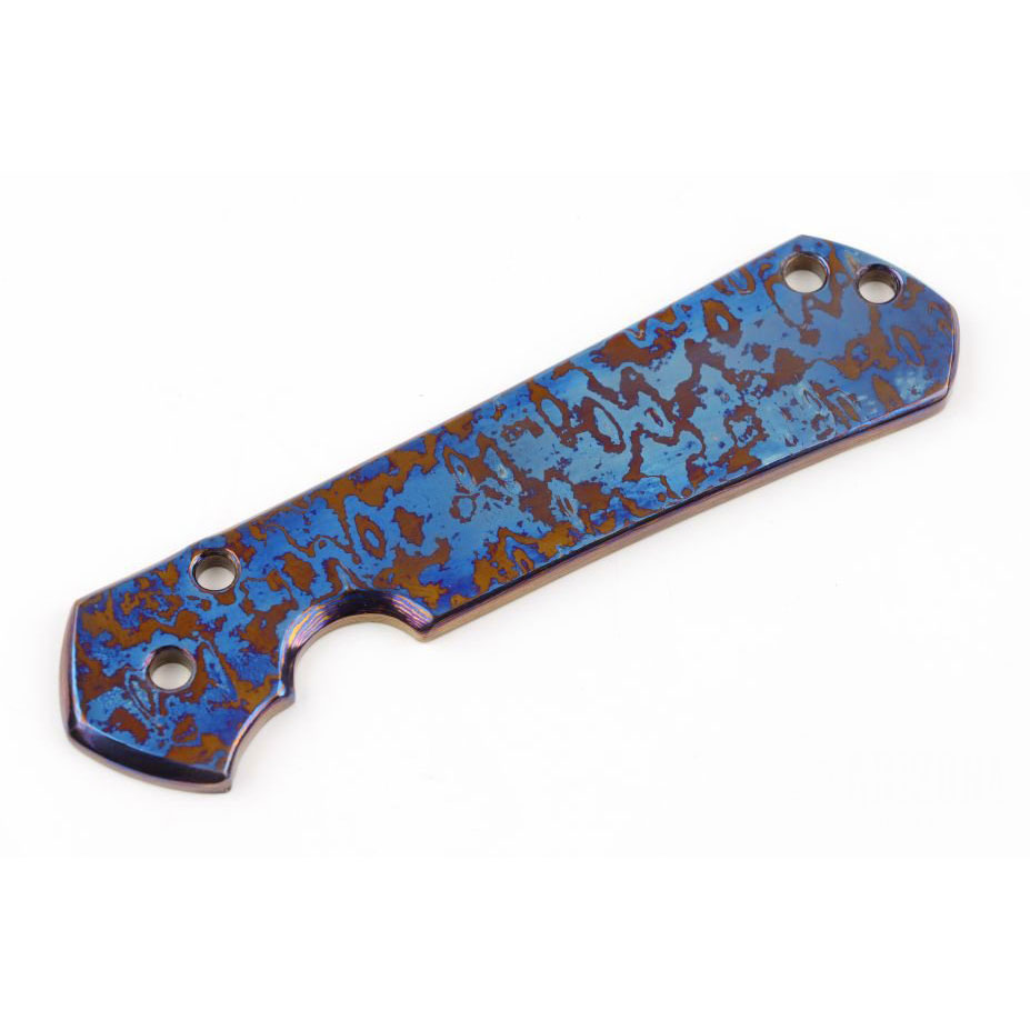 A handcrafted Timascus front Scale for Chris Reeve Sebenza 31, showcasing vibrant heat-treated patterns. This titanium-zirconium alloy upgrade transforms your Knife’s aesthetics while maintaining perfect fit and functionality.