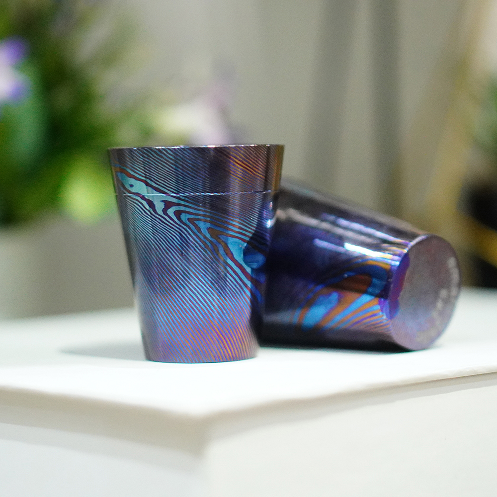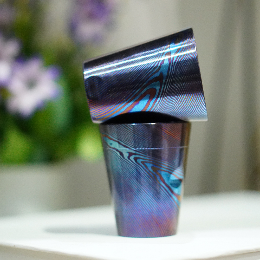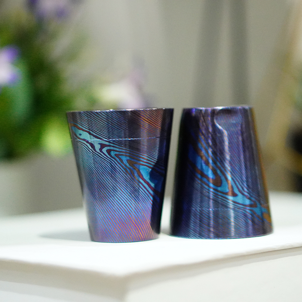 Timascus is a very demanded material that is valued by its unique coloration and incredible strength, and these shot glasses have been crafted using timascus with a high degree of quality to make it an extreme drinking experience. Its titanium alloy has multi layers which are painstaking treated to give dazzling colors, including deep blues to dramatic purples, golds, and reds. The effects are visual and the glasses look stunning straight away so these can be ideal as a collector, as a fan of a finely crafted item or to one who wants to bring a certain grace to their bar accessories.